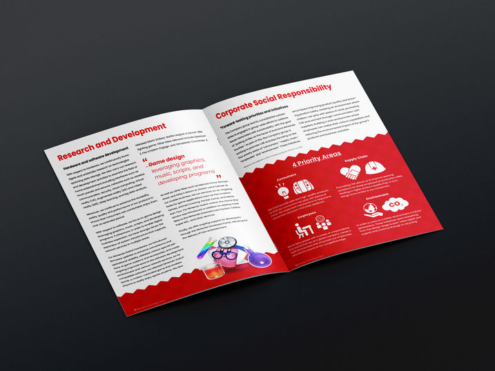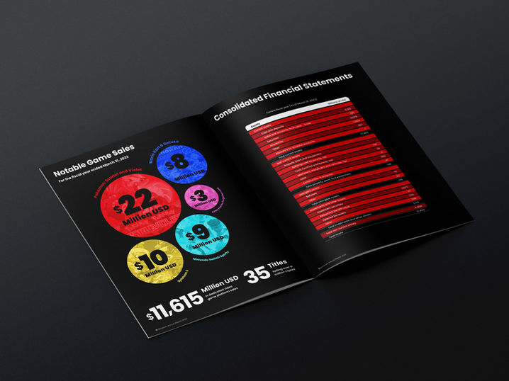 Nintendo's official annual report for the fiscal year ended March 31, 2023 lacked any indication of the modern, fun, and tech-savvy branding that the company is known for. A visually-appealing introductory segment could both inform and captivate the audience of stockholders. I highlighted the most important information, created infographics, and used typography, color, layout, and more to echo the characteristic design language of Nintendo.